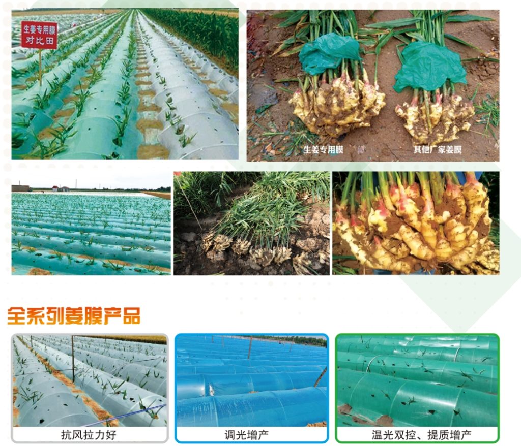 主要特点与功能:生姜专用调光膜扣棚后,透过膜的光线是柔和的散射光,既满足了全株姜苗对光线的需求,又避免了光线直射过强对姜苗造成的灼伤,并能显著的提高姜苗对光能的利用效率,促进生姜的生长,增强生姜对水分、养分的吸收能力。